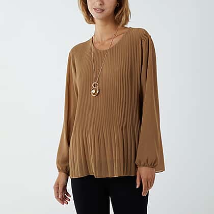 Chilli Charm Pleated Long Sleeve Necklace Top (One Size 8 - 18) - Camel
