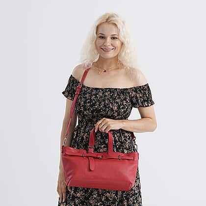 Infuse your look with a pop of colour through this genuine leather belt-detail crossbody bag in red. Crafted from fine leather with a beautifully soft texture, it combines bold style with everyday practicality. The statement belt accent adds a fashionable edge, while the detachable 130 cm strap provides the option to wear it crossbody or carry it by hand. Lined with polyester for durability, it includes two zipped and one slip pocket inside, along with two outer zipped pockets for quick access. A chic essential that effortlessly elevates any outfit.