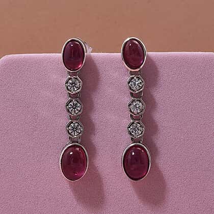 Presenting a striking statement earring, featuring an African ruby in a vertical drop design, creating a perfect movement. African rubies' glow is perfectly complemented by sparkling white zircons, adding extra shine and brilliance. Meticulously crafted in hypoallergenic 925 sterling silver, this earring ensures durability and comfort for sensitive skin. The lustrous rhodium overlay on sterling silver offers a lavish finish and mirror-like shine, enhancing the beauty of the main stone. This dangling earring with vibrant red rubies enhances any ensemble, making it ideal for special occasions and special gifting.