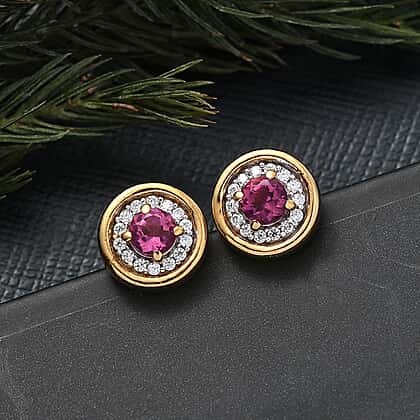 This stunning and classy stud earring is exclusively crafted to uplift your fashion game. The piece features lab-grown bixbite at the centre in a rich red hue, complemented by a halo of moissanite gemstones. Moissanite is known for its extraordinary brilliance and dazzling effect that embodies luxury and shine, resembling real diamonds. Expertly crafted in 18K vermeil yellow gold plating on 925 sterling silver, this earring ensures durability and a warm tone finish. Lightweight yet hypoallergenic, this statement beauty is suitable for sensitive skin and offers comfort. The push post closure clasp provides comfort and security, making it appropriate to wear every day and all day long. Ready to shine brighter with this brilliantly designed stud earring from D'joy.