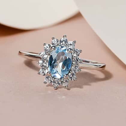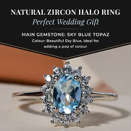 A gorgeous and stylish Sun-inspired Halo Sky-blue Topaz and Natural Cambodian Zircon Ring in Platinum Plated Sterling Silver. This piece of jewellery sparkles and fires with an oval faceted cut Sky-blue Topaz with larger sides and a number of round faceted cut Zircons totalling 1.28 carats. The ring's durability is further enhanced by its sleek straight shank, which supports the ring's gemstone-studded head.