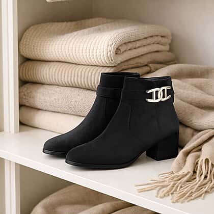 Step up your footwear game with the Zelda suede-look ankle boot in black, designed for women who love versatile style. The sleek faux suede exterior complements everything from jeans to skirts, while the gold buckle accent adds a refined contrast. Its mid-heel shape provides a comfortable height, perfect for long wear, and the synthetic lining ensures a soft, cosy fit. Completed with a resin sole for added traction and an inside zip for convenience, these boots strike the perfect balance between practicality and sophistication.