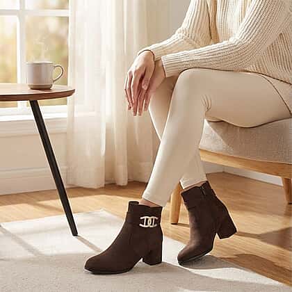 Add a warm, polished finish to your outfit with the Zelda suede-look ankle boot in brown, a stylish choice for every season. Made from soft faux suede, this ankle boot exudes sophistication with its gold buckle trim and classic silhouette. The block mid-heel provides gentle elevation, making it ideal for both day and evening wear. A resin sole adds dependable grip, while the inside zip ensures easy wear every time. Combining comfort, durability and style, this pair will quickly become your wardrobe favourite.
