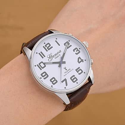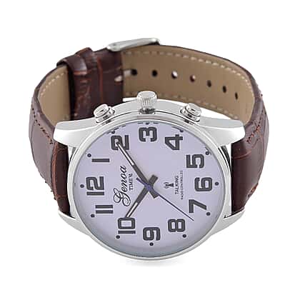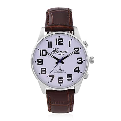 GENOA TIME V2 Quartz Movt. 3ATM Water Resistant White Dial Talking Watch with Brown Colour Leather Strap and Silver-Tone Case