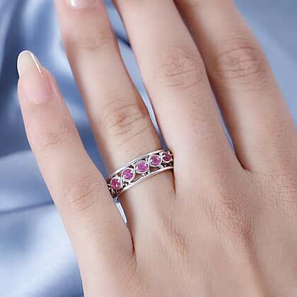 A fusion of beauty and healing, this Ruby Chakra Spinner Band Ring looks fabulous in Rhodium Overlay Sterling Silver. The ring from the GP Art Deco Collection is dotted with round rubies along the Spinner band. The base ring crafted in silver is sturdy and does not irritate the skin even after long periods of use.