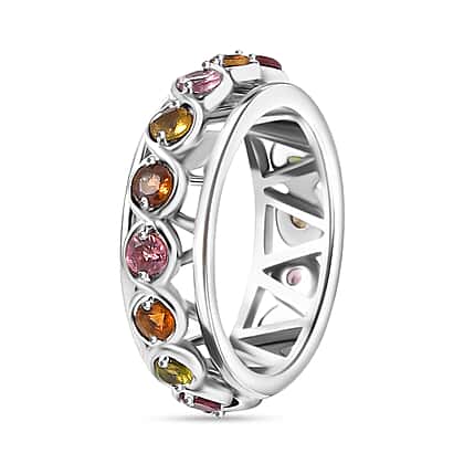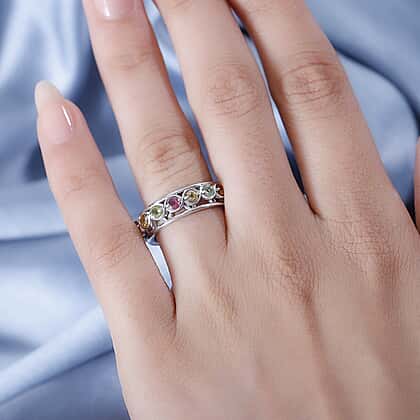 A staple for every connoisseur, the Multi Tourmaline Chakra Spinner Band Ring will take care of your looks and stress levels! The ring gets its designer look from the Rhodium Overlay Sterling Silver crafting. The ring from the GP Art Deco Collection has a vintage appeal that lends it an understated grace. The spinner band alleviates your stress levels with a free rotatory action.
