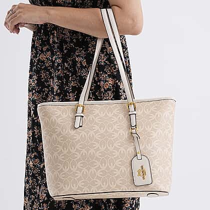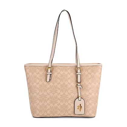 This structured monogram bag in beige hue is just the piece that can go with everything. The subtle and muted hue makes this bag versatile and easy to pair with any outfit. Whether you are looking for a bag for work or one that can hold your credit cards, lip balms, and creams all in one place when you are out in the town, whatever your need is, it can keep all your items secured. It features a zipper closure inside and comes with segregated compartments. It also features a polyester inner lining that adds a sense of durability and allows the bag to hold its shape. Made with PVC material, this beige bag features a top handle and comes with an additional shoulder strap that can help keep your hands free.