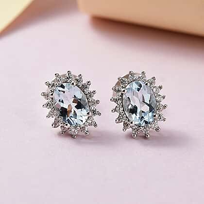 Aquamarine March Birthstone Halo Stud Earrings with Cambodian Zircon in Platinum Overlay Sterling Silver