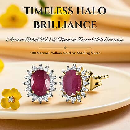 African Ruby (FF) & Natural Zircon Halo Earrings with Push Back in 18K Vermeil Yellow Gold Plated Sterling Silver 2.32 Ct.