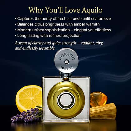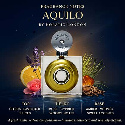 Immerse yourself in the essence of a seaside escape with Horatio Aquilo Eau de Parfum. Designed to evoke the carefree bliss of a coastal summer vacation, this scent combines the zest of citruses with the soothing freshness of lavender and spices. A heart of floral notes, including rose and woody accents, adds depth and elegance, while base notes of amber and vetiver provide a warm, lasting finish. Perfect for everyday wear, this fragrance transports you to sun-drenched days by the shore with every spritz. An irresistible blend of freshness and sophistication, it’s your ideal companion for all seasons.