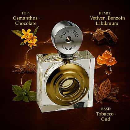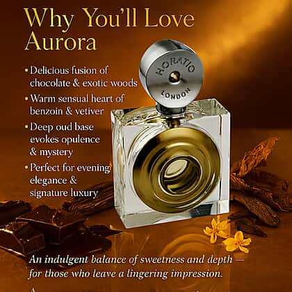 Horatio AURORA Eau de Parfum is a luxurious scent that blends the richness of chocolate with warm, earthy notes to create a truly decadent fragrance. The top notes of osmanthus and chocolate give way to a heart of vetiver, benzoin, and labdanum, offering a deep, intoxicating aroma. The base notes of patchouli, tobacco, and oud add a sophisticated finish, making it ideal for everyday wear and special occasions. A perfect fragrance for the home or as a personal indulgence, AURORA is sure to leave a lasting impression.