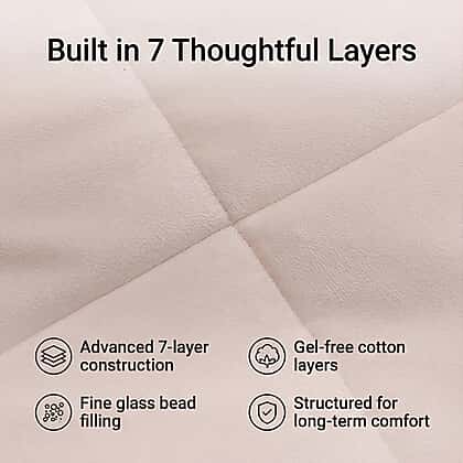 Its advanced 7-layer construction combines velour fleece fabric, polyester fabric, gel-free cotton layers, and fine glass bead filling. The glass beads are evenly distributed through stitched quilting to maintain consistent weight and prevent movement, ensuring balanced comfort throughout the night.