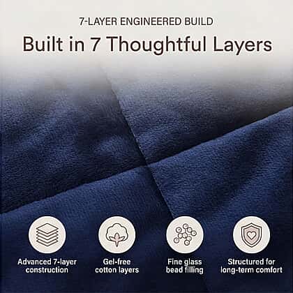 Its advanced 7-layer construction combines velour fleece fabric, polyester fabric, gel-free cotton layers, and fine glass bead filling. The glass beads are evenly distributed through stitched quilting to maintain consistent weight and prevent movement, ensuring balanced comfort throughout the night.
