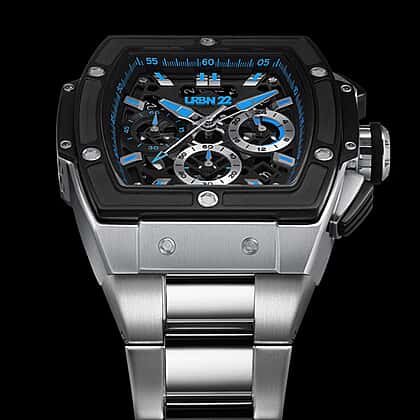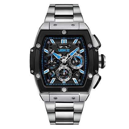 URBN22 Arctic Blue Japanese Quartz VD53 Chronograph 5ATM WR Black - Blue Dial - Silver Case Mens Watch with Silver Stainless Steel Strap