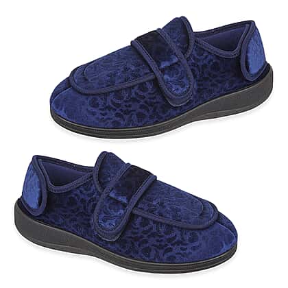 Discover the jo ladies wide fitting multi-opening slipper, designed for ultimate comfort and ease. These slippers feature memory foam insoles that provide a cushioned, supportive fit, making them ideal for all-day wear. The adjustable Velcro straps allow for a custom fit, ensuring that the slippers stay comfortably in place. The stylish navy design is complemented by a soft and durable upper, making these slippers perfect for relaxing at home or casual outings. With their practical design and luxurious feel, they are a must-have for comfort and style.