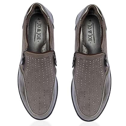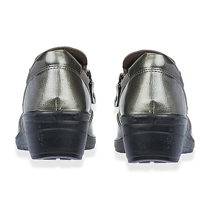 Enjoy comfort and support with the Jo-Joe Jessica wedge shoe in a pewter shade, designed for easy everyday wear with a bright, modern look. The soft upper provides a gentle fit across the foot, while the metallic trim adds a stylish lift without feeling overpowering. A practical side zip lets you slip them on and off with ease, making them perfect for busy days. The cushioned insole and lightweight wedge work together to give steady comfort with every step. A dependable choice for walking, errands or long hours on your feet.
