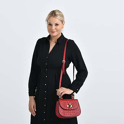 La Marey Snakeskin Embossed Genuine Leather Mini Satchel Bag with Bamboo Handle - Red