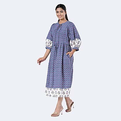 Step into easy elegance with this La Marey hand block print cotton dress in a graceful blue palette. Made from 100% breathable cotton, it showcases fine hand block motifs across the fabric, celebrating artisanal craftsmanship. The gathered waistline offers a flattering, relaxed fit, while the voluminous three-quarter sleeves add a soft, romantic drape. A tie-front round neckline enhances its charming appeal. The contrasting white border at the hem and cuffs, adorned with intricate prints, lends a refined finish. Ideal for leisurely weekends or casual outings, this dress blends tradition with everyday comfort.