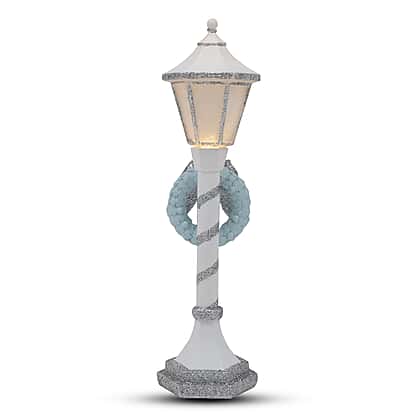 Bring festive charm to your home with this large Christmas street lamp with LED light in classic white. Beautifully designed with a glittering gold base, candy cane stripes, and a decorative wreath, it adds a touch of nostalgia to your indoor Christmas décor. Measuring 40.6cm tall, this elegant lamp emits a soft, warm glow powered by batteries, making it easy to display anywhere without messy wires. With a simple on/off switch for convenience, it’s perfect for mantelpieces, hallways, or table settings, creating a cosy, magical ambience that captures the spirit of the season beautifully.
