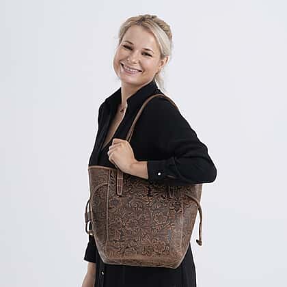 100% Geniune Leather Floral Embossed Tote Bag - Brown