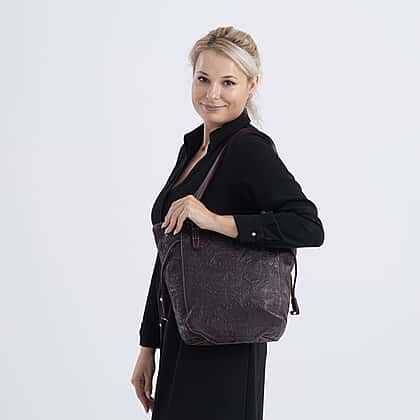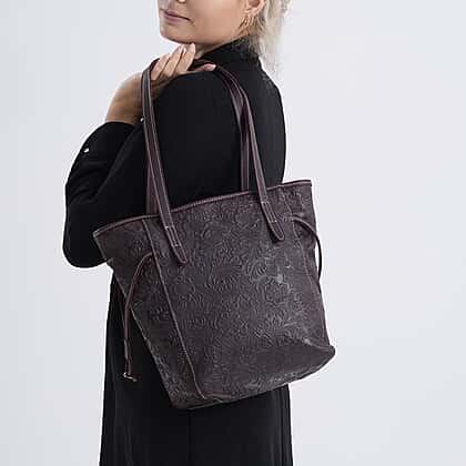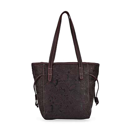 100% Geniune Leather Floral Embossed Tote Bag - Dark Coffee