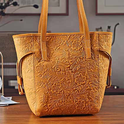 100% Geniune Leather Floral Embossed Tote Bag - Mustard