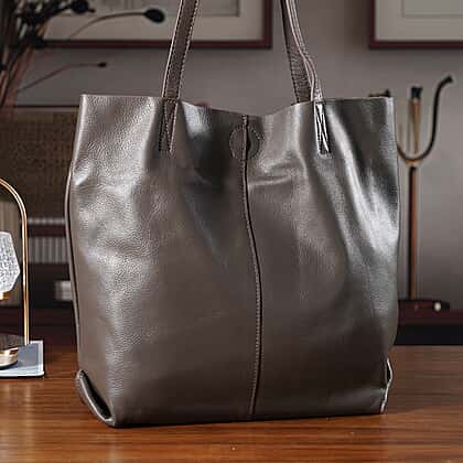 2-in-1 Genuine Leather Tote Bag - Pouch - Dark Grey
