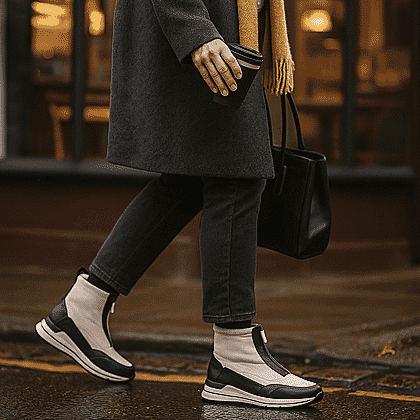 Redefine casual style with the Lotus Petra Ankle Boots, blending the sporty comfort of a trainer with the chic silhouette of an ankle boot. Crafted with faux leather and textile, this black boot boasts a sleek, modern aesthetic. The convenient front zip adds a contemporary edge and ensures effortless wear. The Petra ankle boot features a subtle 3.5cm wedge heel, providing all-day comfort without compromising style. Perfect for elevating your off-duty looks, this versatile footwear option is a must-have for fashion-forward wardrobes.