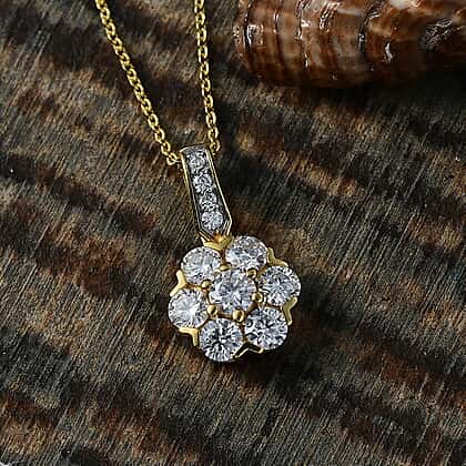 Bringing the brilliance of moissanite to you with this stunning pendant, featuring dazzling round-cut moissanite stones in an intricate cluster design. The moissanite gemstone is known for its extraordinary shine and brilliance that captures light from every angle. Crafted from hypoallergenic 925 sterling silver, this piece ensures durability and comfort for the skin. The yellow gold plating on sterling silver offers a lustrous finish, and the secure lobster clasp provides a comfort fit. Ideal for special occasions and gifting to your loved ones, this pendant embodies sophistication and grace.