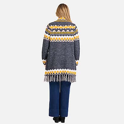 Add a bohemian flair to your look with this Mudflower Fringed Aztec Cardigan. This warm and comfortable piece features vibrant aztec patterns in yellow,grey, and white hues. Made with acrylic, this cardigan features an open-style front that allows for easy layering. This long-line silhouette comes with a fringed hem that helps add a playful touch to the design. Wear it over a simple tee and jeans or style it with a neutral dress to strike a stylish look.