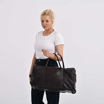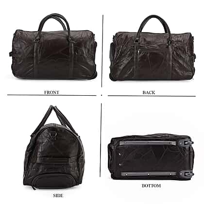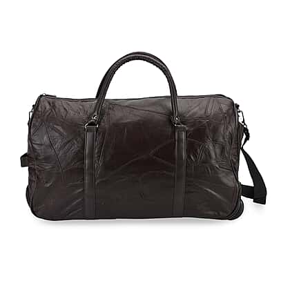 Rediscover travel luxury with this beautifully crafted brown patchwork sheep leather travel bag. Combining durability with style, it features a naturally textured leather finish that gets even better with age. The generous main compartment and smartly placed zipped pockets make packing a pleasure, while the polyester lining keeps your belongings protected. Designed for ease, the sturdy trolley handle and detachable shoulder strap ensure versatility in every journey. A refined statement piece for women who travel with both grace and purpose.