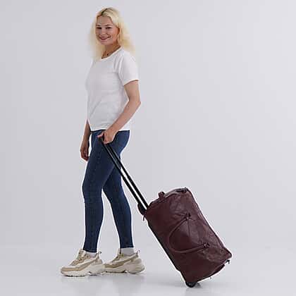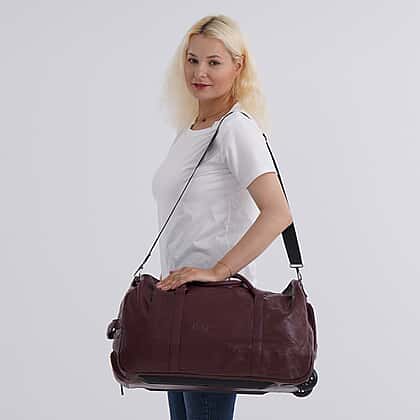 Elevate your travel look with the rich charm of this burgundy patchwork sheep leather travel bag. Designed with elegance in mind, it features a deep wine-toned leather exterior that adds a touch of sophistication to your journeys. The roomy interior and multiple zipped pockets provide ample space to keep everything organised. Whether you carry it by hand, over your shoulder, or roll it smoothly on its trolley wheels, this versatile design makes travel feel effortless and refined. Perfect for women who value timeless craftsmanship and practical style.