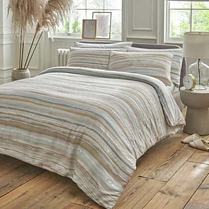 This duvet cover set's stylish and unique painterly stripe design is perfect for decorating your bedroom with a lively feel and touch. This set includes a blush colourway with pearlised and stunning neutral tones. This fully reversible duvet set is made from 100% cotton and produced in 200 thread count cotton sateen for a luxurious and smooth feel.