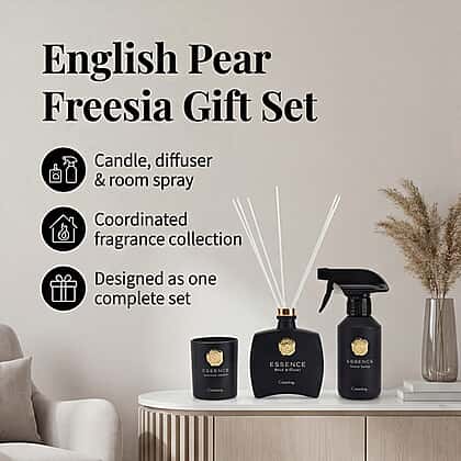 Shaping a soft, welcoming mood at home, the LIVMORE Essence Fragrance Gift Set pairs an English pear and freesia scent with a candle, diffuser and room spray. The candle sits in a smooth white jar, the diffuser offers steady fragrance through slim reeds, and the 100ml spray delivers quick bursts of freshness. Gold accents and clean lines make the set easy to place on shelves, bedside tables or hallways. With its floral-fruit blend and long-lasting scent, it’s a lovely choice for anyone who enjoys uplifting scents and wants to effortlessly create a peaceful atmosphere.