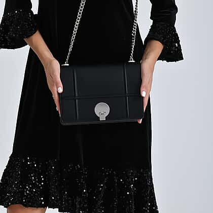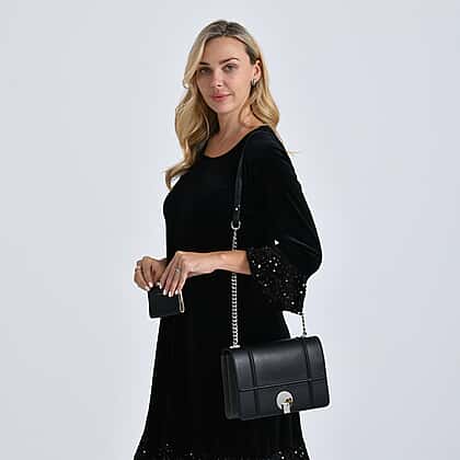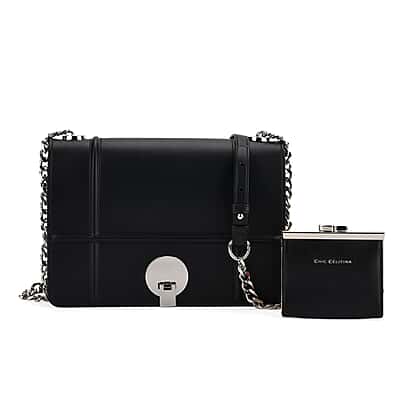 Set of 2 Structured Panel Bag with Silver Chain Strap & Matching Card Slot Purse - Black