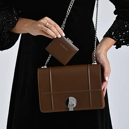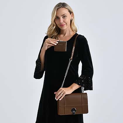 Set of 2 Structured Panel Bag with Silver Chain Strap & Matching Card Slot Purse - Brown