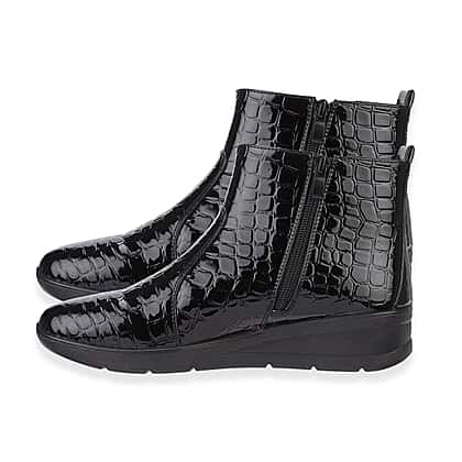 Discover easy comfort and polished everyday style with these Shoetree low wedge ankle boots, finished in a glossy black croc texture that adds a thoughtful touch to any outfit. The soft side gusset provides gentle flexibility around the ankle, while the inside zip makes it simple to slip on and off without adjusting the fit. A cushioned insole supports the foot through long days, and the lightweight wedge offers subtle lift that feels effortless to wear. Ideal for daily errands, workdays or relaxed outings, these boots deliver comfort and practicality in one dependable pair.