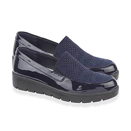 Bring lightweight comfort and easy everyday wear to your wardrobe with these Shoetree twin gusset slip-on shoes, styled in sleek navy blue with subtle diamante detailing across the upper. The twin elastic gussets provide gentle flexibility, allowing the shoe to move naturally with the foot while making it simple to slip on and off. A cushioned insole supports you through long days, and the lightweight sole helps reduce fatigue during walking or daily errands. Perfect for casual outings, travel or workdays, this pair offers comfort, practicality and a hint of sparkle.