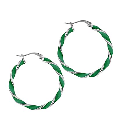 Green Enamel Large Twister Hoop Earrings in Sterling Silver Rhodium Plated 31mm