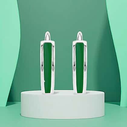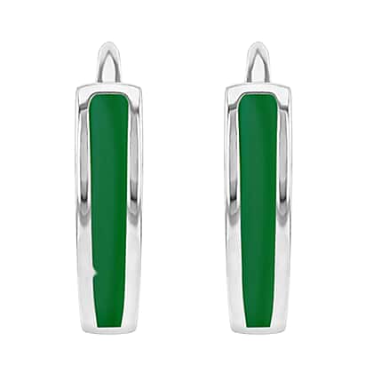 Green Enamel V Shape Huggie Hoop Earrings in Sterling Silver Rhodium Plated
