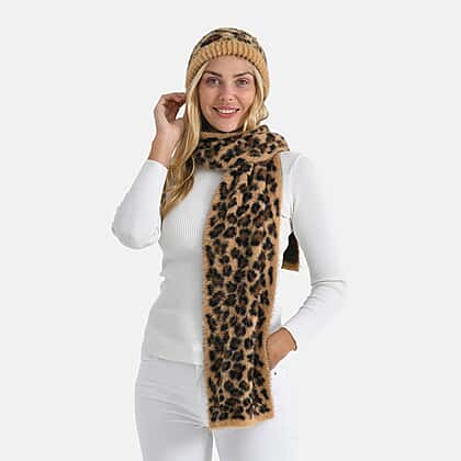 Styled By 2 Piece Leopard Print Scarf and Hat (One Size) - Brown