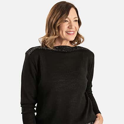 Sugar Crisp Elegant Fine Knit Metallic Trim Boatneck Jumper (Size S) - Black