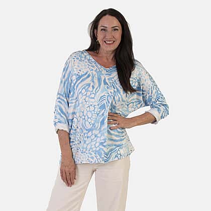 Sugar Crisp Italian Made V-Neck Abstract Print Top One-Size (Fits upto Size 18) - Blue
