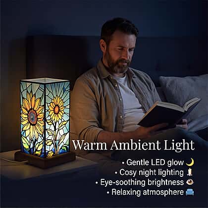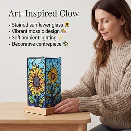 Sunflower Cosmic Stained Painted LED Table Lamp with Ash Wood Base - USB Powered Night Light (17.5cm) - Multicolour