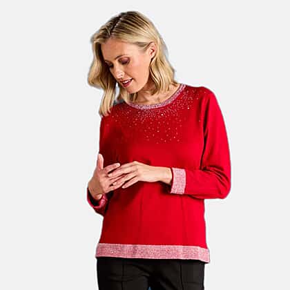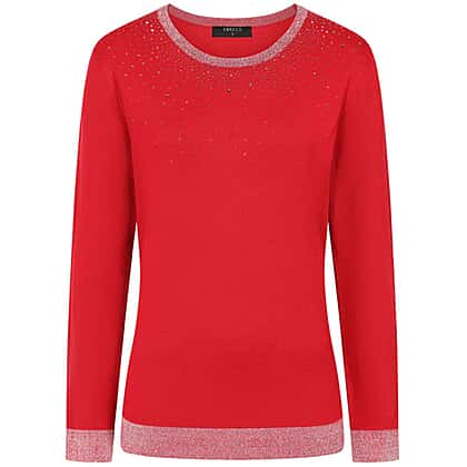 This season stays stylish effortlessly with this red Knitted jumper, a classic fusion of comfort and glamour. Crafted with soft and premium material with shimmering embellishments at the neckline that catches attention and light beautifully. This soft knit is perfect for the winter season and the captivating contrast of red and silver adds refined touch, making it suitable for classy evenings. This relaxed fit jumper can be paired effortlessly with any bottom wear like jeans or trousers, offering style.