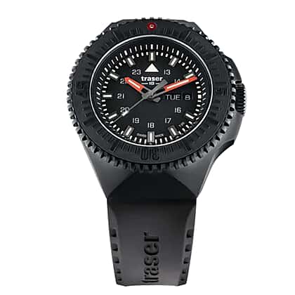If you like the toughness and thrill of an adventure, this Traser P69 Black Stealth Watch makes for a great pick. Powerful, sleek, and built for the toughest moments, the P69 Black Stealth blends high performance with modern, understated style. Its black dial and matte black PVD-coated stainless steel case create a clean, tactical look that feels both bold and minimal. The ceramic bezel insert resists scratches, while the anti-reflective sapphire crystal keeps visibility sharp in any light. Designed for durability, it features a comfortable black rubber strap made for long wear, from outdoor adventures to everyday routines. Running on a precise Swiss quartz movement, this watch stays reliable when it matters most. Water-resistant up to 20 bar, it is ready for rain, rough terrain, and everything in between. Trigalight markers and glowing hands offer easy readability after dark, making it a timepiece built for confidence and control.