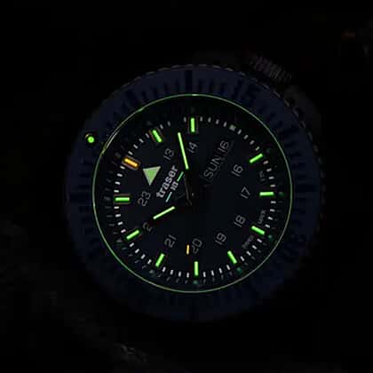 If you like the toughness and thrill of an adventure, this Traser P69 Black Stealth Watch makes for a great pick. Powerful, sleek, and built for the toughest moments, the P69 Black Stealth blends high performance with modern, understated style. Its blue dial and matte black PVD-coated stainless steel case create a clean, tactical look that feels both bold and minimal. The ceramic bezel insert resists scratches, while the anti-reflective sapphire crystal keeps visibility sharp in any light.Designed for durability, it features a comfortable green rubber strap made for long wear, from outdoor adventures to everyday routines. Running on a precise Swiss quartz movement, this watch stays reliable when it matters most. Water-resistant up to 20 bar, it is ready for rain, rough terrain, and everything in between. Trigalight markers and glowing hands offer easy readability after dark, making it a timepiece built for confidence and control.