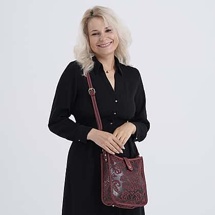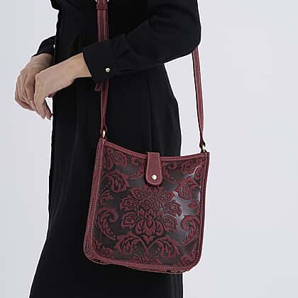 Genuine Leather Crossbody Bag with Embossed Floral Brocade - Red