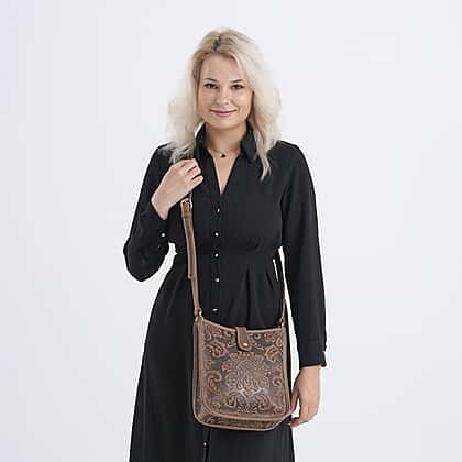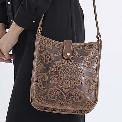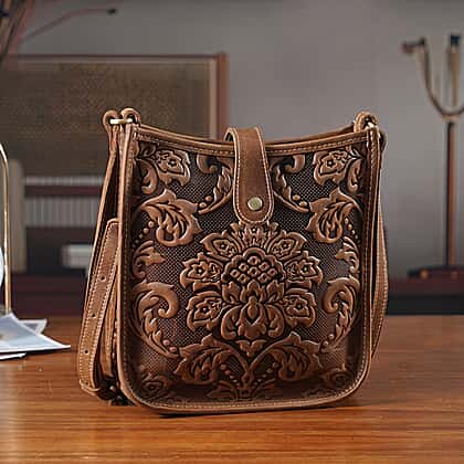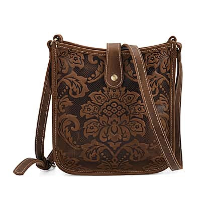 Genuine Leather Crossbody Bag with Embossed Floral Brocade - Dark Brown
