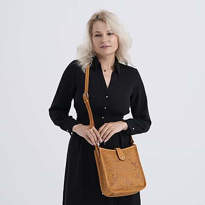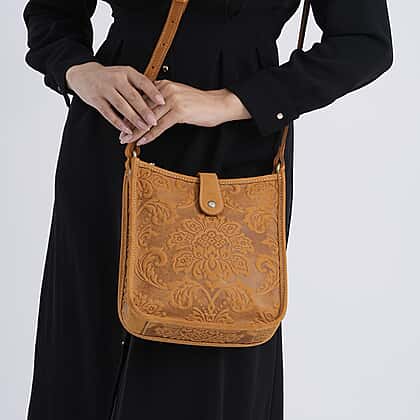 Genuine Leather Crossbody Bag with Embossed Floral Brocade - Tan